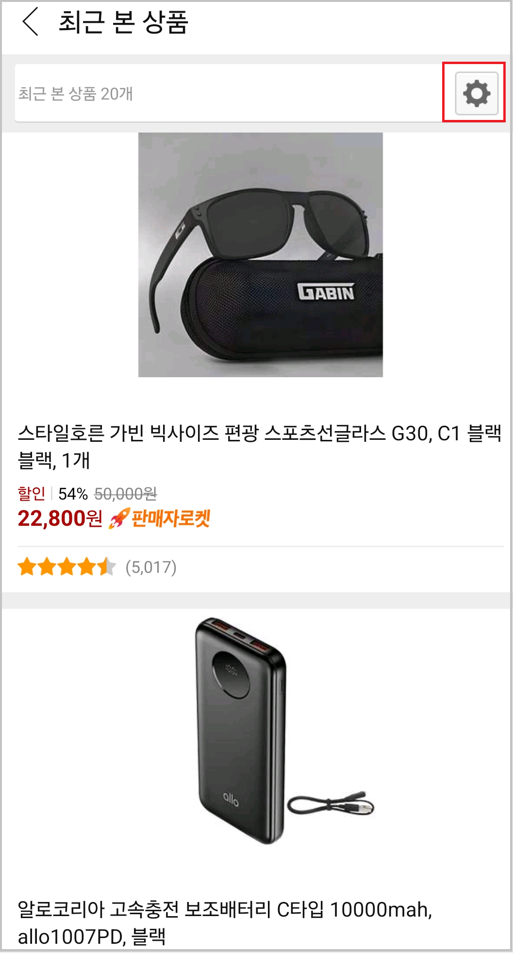 2. 최근 본 상품에서 "톱니바퀴" 클릭 → 최근본 상품 "X" 버튼을 클릭하여 삭제하기