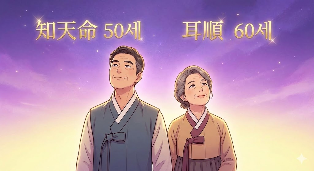지천명 (50대): 성공과 실패를 충분히 경험하고 나서 진짜 자신이 원하는 삶의 방향을 찾는 시기. 다른 사람의 기대나 사회적 기준이 아닌, 진정한 자기 자신의 목소리를 듣게 되는 때.